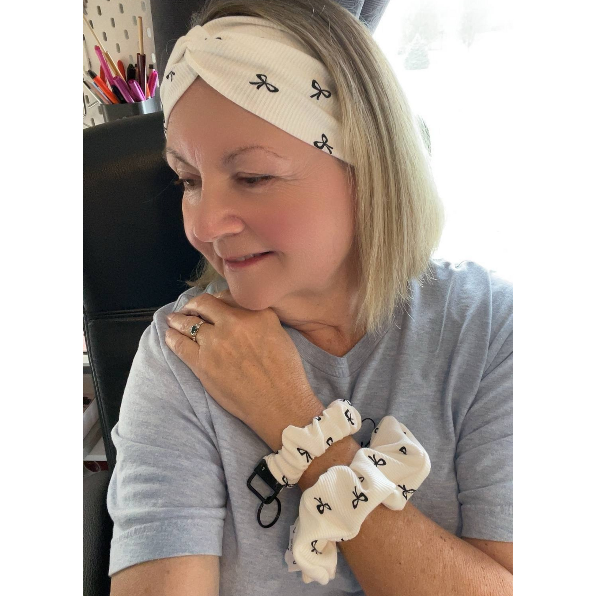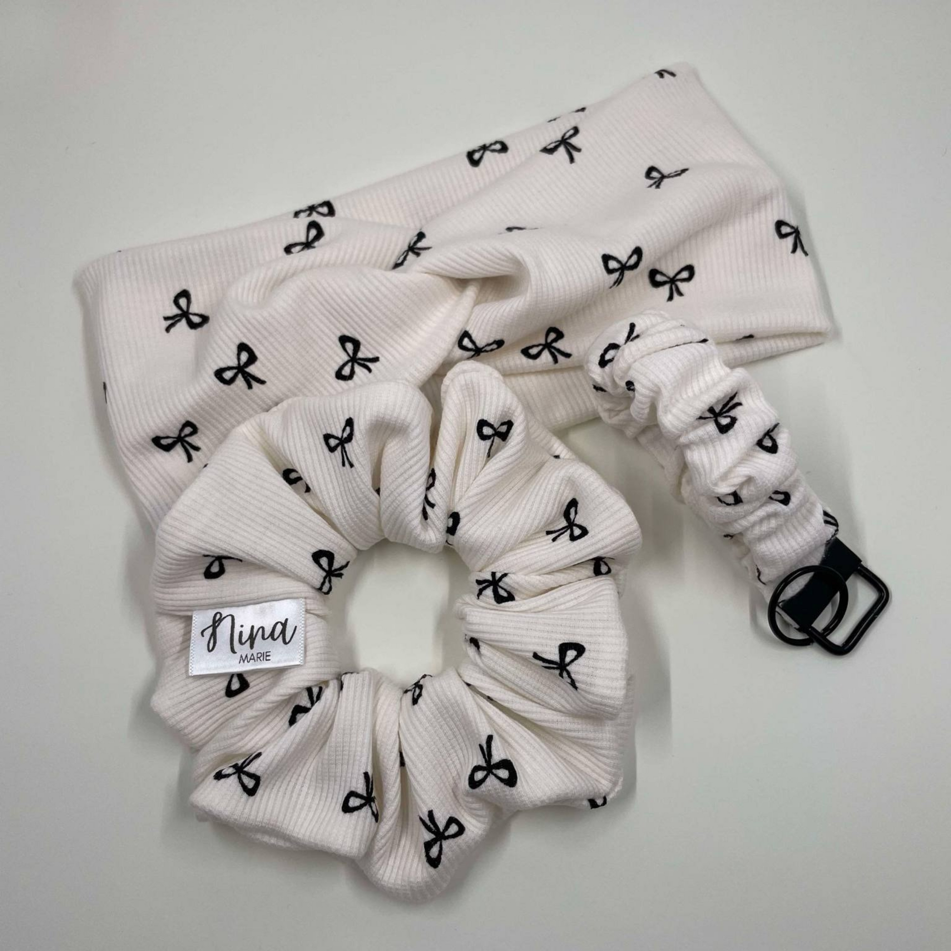 Transform your hair with our adorably delightful BONITA'S BOW-MANCE hair scrunchie! Boasting trendy mini black bows on a cream-colored, ribbed fabric that's so soft, it's the ideal way to elevate your locks to new heights. Not only does it add flair and effortlessly match countless looks, from casual to dressy, but it's also kind to your hair, detangling and fighting knots with ease. Don't miss out on completing your look with our coordinating Bonita's Bow-Mance Twisted Headband and Scrunchie Keychain (available separately)!