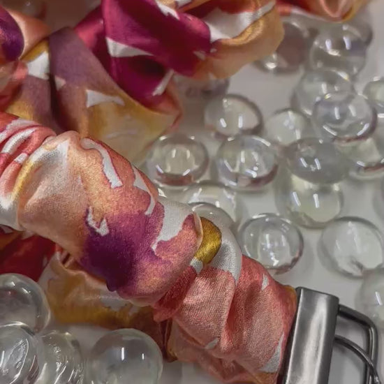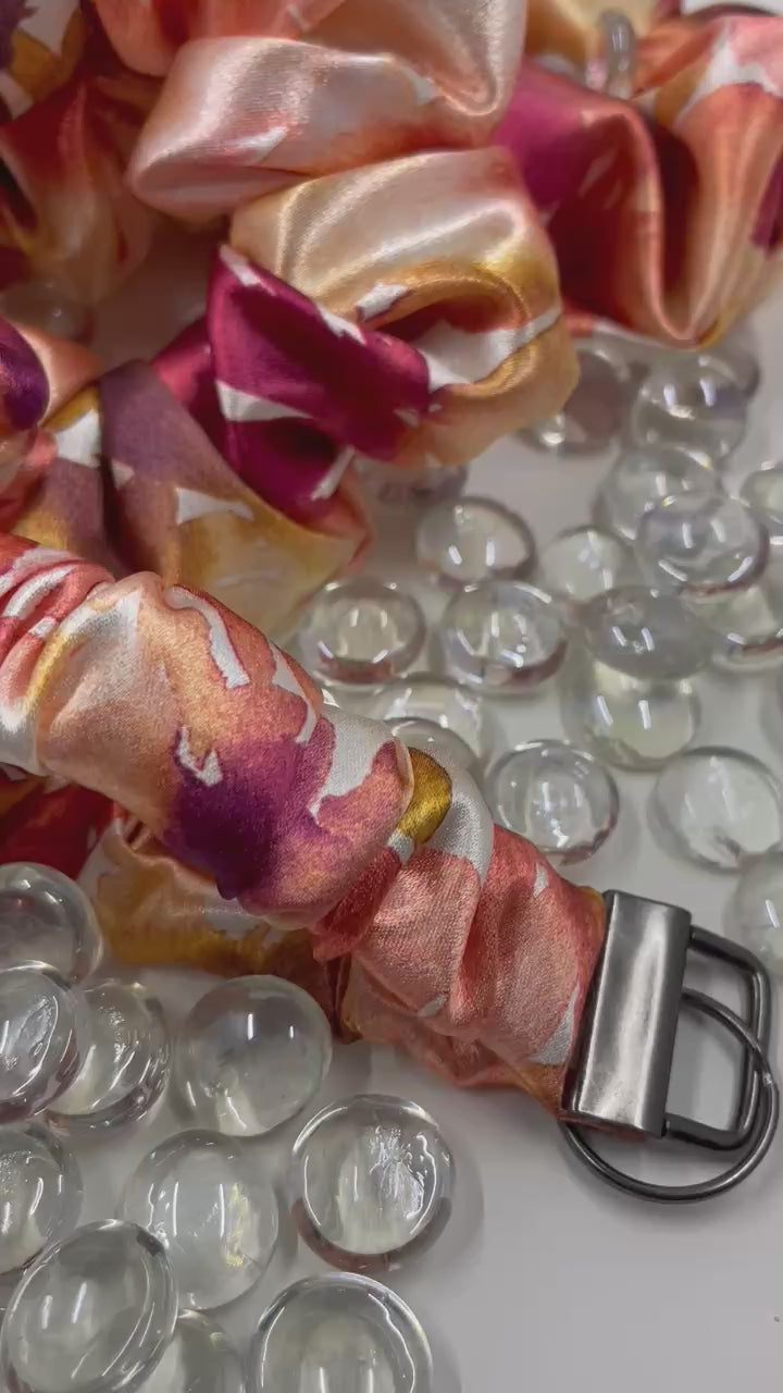 Indulge in THE AUTUMN CHARMEUSE SCRUNCHIE, crafted from sumptuous charmeuse fabric. This luxurious scrunchie boasts a palette of warm red, peachy orange, and buttery gold, providing the perfect finishing touch to elevate any hairstyle and complement your wardrobe essentials. Its fluffy charm exudes refined luxury and tranquility, adding a sophisticated touch to any ensemble, all while staying put! Complete the look with the AUTUMN keychain for the ultimate level of elegance (sold separately).