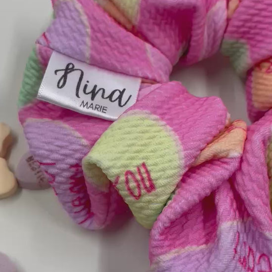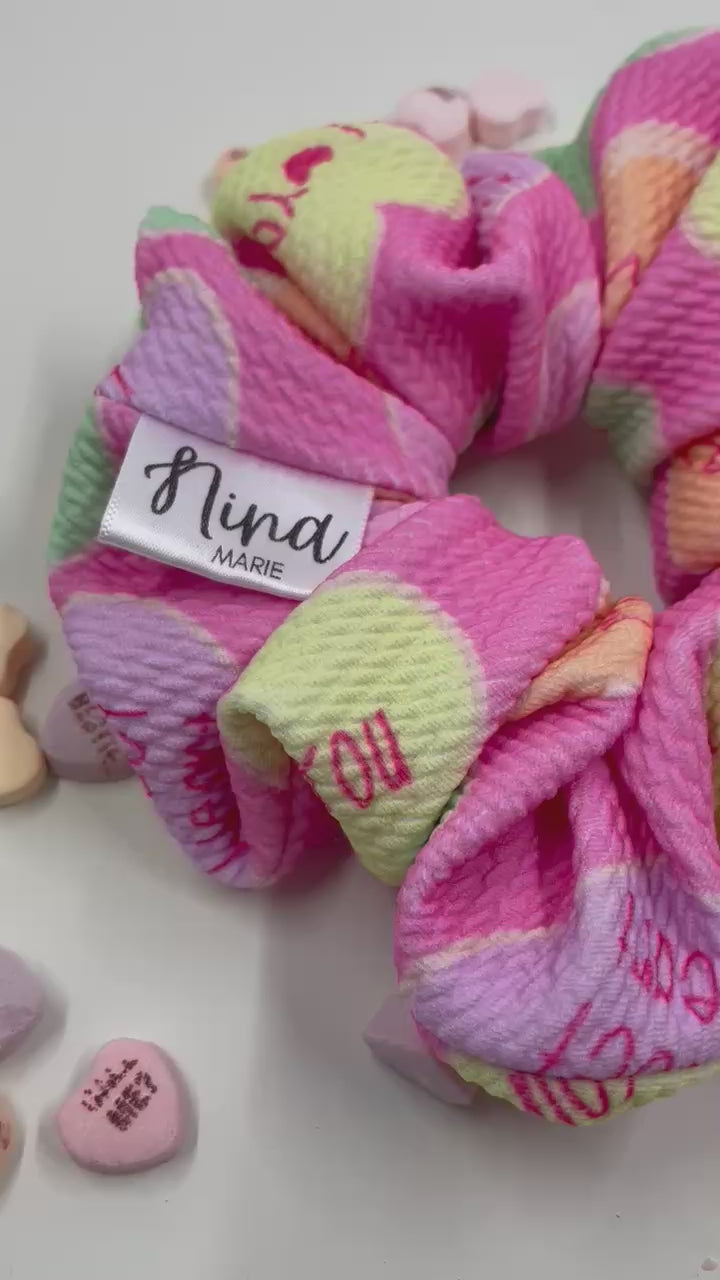 Indulge in the love with THE BE MINE VALENTINE XL scrunchie - a scrunchie that not only keeps your locks in place, but also transports you back to the good ol' days of trading Valentines with friends and sneaking candy hearts to your secret crush. Crafted from a flexible and cozy fabric adorned with nostalgic conversation hearts, this scrunchie is a must-have for your hair accessory arsenal! XL scrunchies mean more fluff, more flirt, more fun!