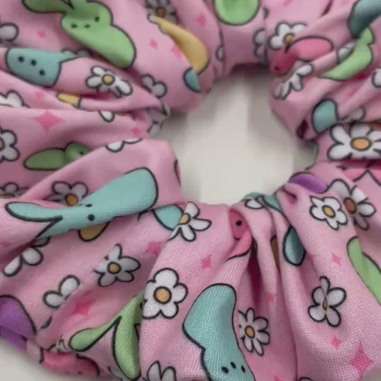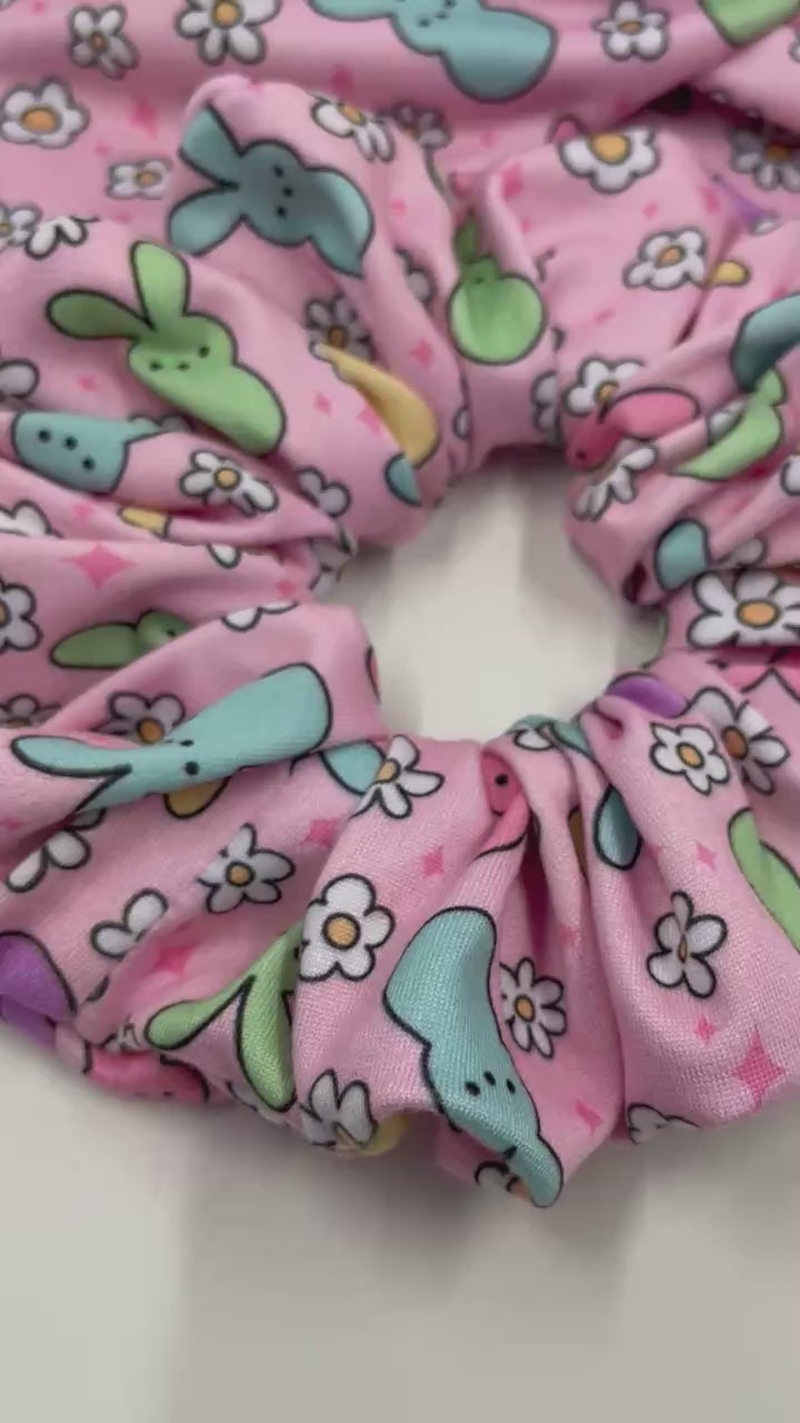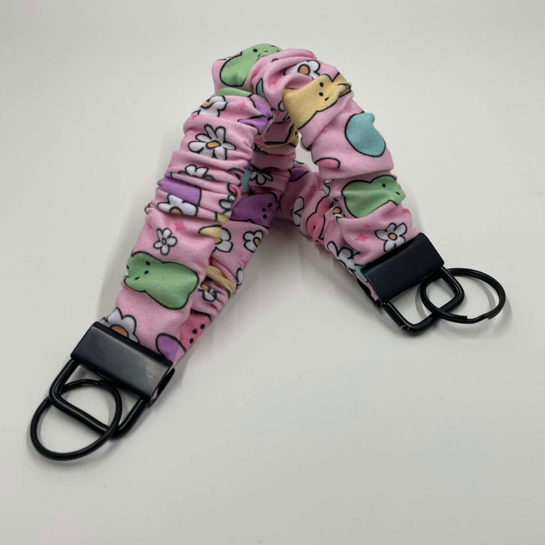 Get ready to spring into style with the HIPPITY HOPPITY BUNNY Scrunchie Keychain! This trendy accessory is a sweet reminder of Easter baskets overflowing with marshmallow goodness. Keep your essentials at hand with our soft and functional handmade scrunchie wristlet key fobs - perfect for keys, IDs, hand sanitizer, and more!